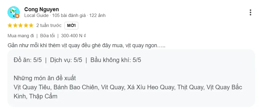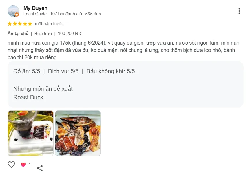 Uy tín của vịt quay Vĩnh Phong đến từ hàng nghìn phản hồi tích cực mỗi năm. Khách ghi nhận da giòn lâu, thịt không bở, hương vị cân bằng, phần ăn hậu hĩnh. Bạn có thể tham khảo cảm nhận thực tế để tự tin chọn nơi mua vịt quay uy tín.